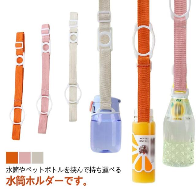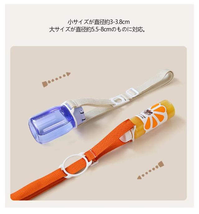 | 水筒やペットボトルを挟んで持ち運べる水筒ホルダーです。 持ち運びもしづらく鞄にも入れづらいサイズのペットボトルを肩掛けでストレスフリーに! サイズが2パターン用意されている為、用途やシーンによって使い分けが可能。小サイズが直径約3-3.8cm大サイズが直径約5.5-8cmのものに対応。 長さ調整可能ストラップで大人も子どもも使える。広めにとられた幅で肩にかけた際も食い込みにくく快適に着用可。 アウトドア等で汚れた際も水洗いが出来るベルトは、清潔さを保てます。 | |