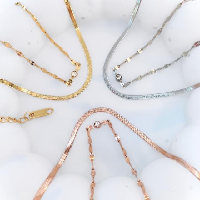 スネークチェーンとペタルチェーンの組み合わせが、カジュアルからフォーマルまで幅広いシーンで活躍します。