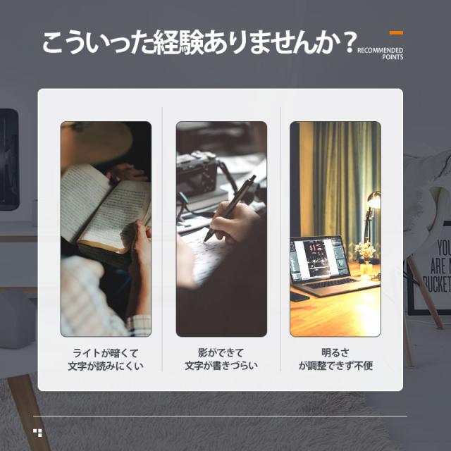 - デスクライトとして使用するには、暗いと感じます。 設置場所 目線に、ライト部分が入ると、自分の目にばかり、光が入りすぎ、机の上の対象物に光は、充分に届きません。 机の真上に設置したとしても、位置が遠...