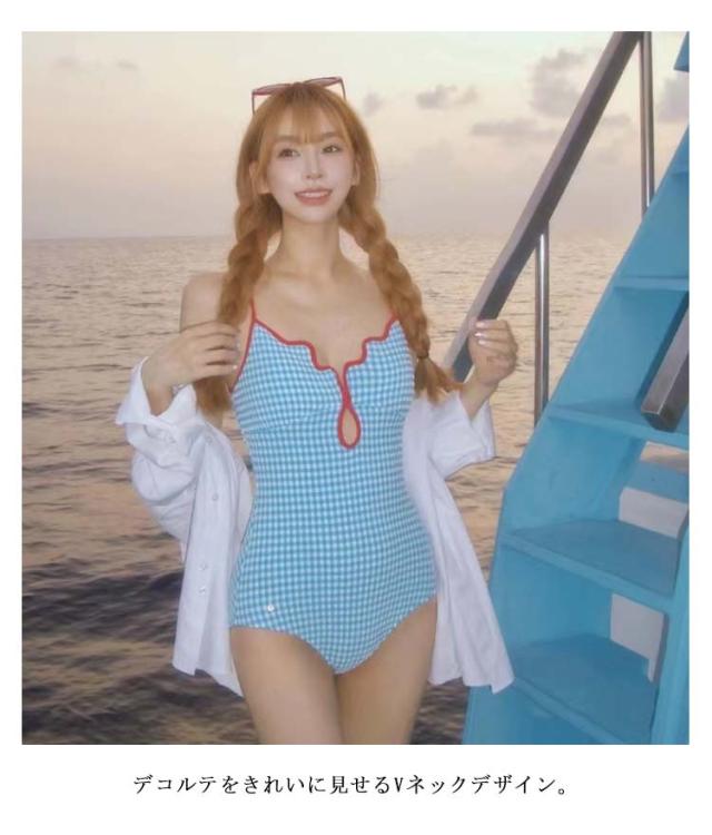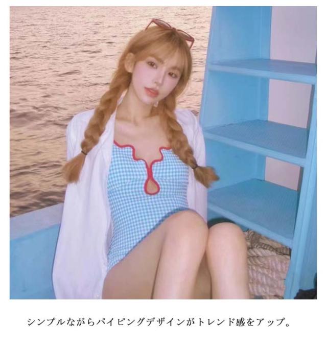 | チェック柄が目を惹く、レトロ可愛いワンピース水着。 デコルテをきれいに見せるVネックデザイン。 シンプルながらパイピングデザインがトレンド感をアップ。 | |