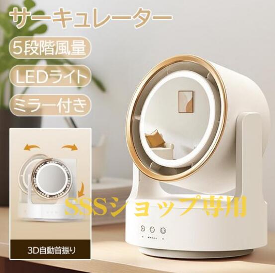 サーキュレーター 卓上扇風機 2400mAh LEDライト ミラー付き 3D首振り 空気循環 首振り扇風機 リビング扇風機 5段階風量調節 省エネ