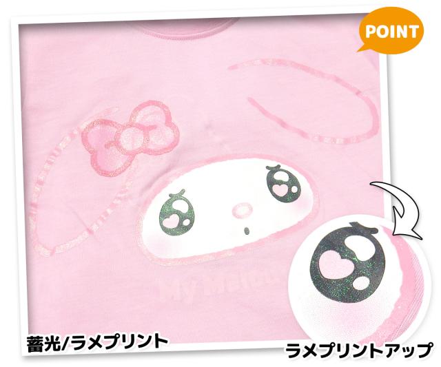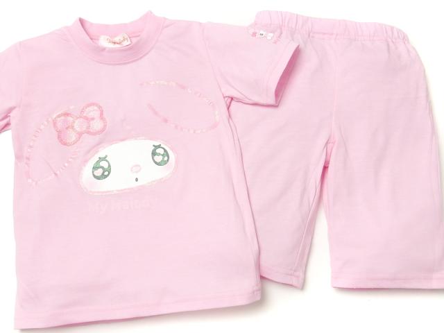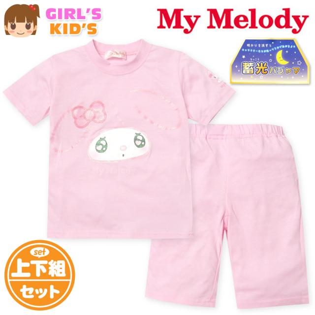 【送料無料】女児 キッズ 天竺 半袖 光るパジャマ Sanrio サンリオ マイメロディ ハーフパンツ 上下組 蓄光 ラメ フェイスプリント 子供服 女の子 100cm 110cm 120cm 130cm td-0790【メール便対応】