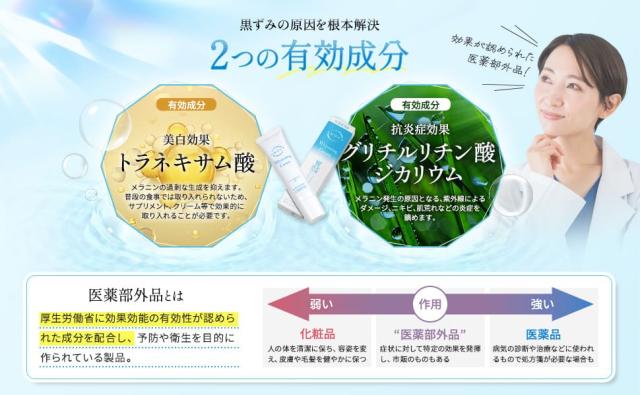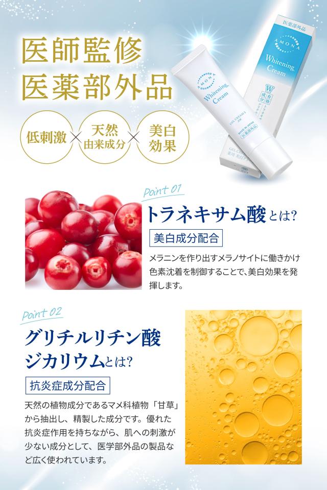 【Wの医薬部外品】有効成分のトラネキサム酸(美白、シミ防止)とグリチルリチン酸ジカリウム(肌荒れやニキビやひび・あかぎれのうるおいバリア)を配合。 肌あれを抑える効果が高いため“医薬部外品”として厚生労働省より承認を受けています。 そのため、美白クリームとして肌あれが起きやすい方にもおすすめです。