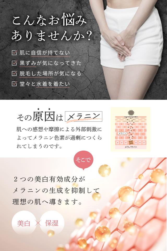 顔、ワキ、肘、膝、乳首、バスト、VIOに使えるオールインワンボディケアクリームです。