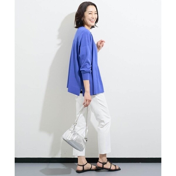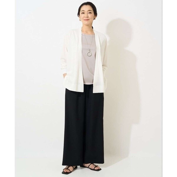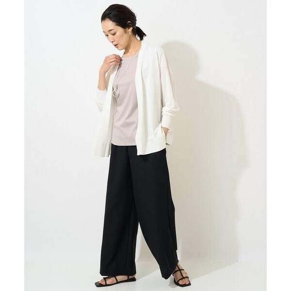 接触冷感機能のある、超強撚コットン素材を使ったカーディガン。前身頃は釦レスで、さらっと羽織るだけでスタイルが決まる着流しデザインの万能アイテム。袖は少しゆとりのあるサイズなのでインナーの袖の形を選ばず、着回ししやすい一着です。薄手のニット素材でさらっとカットソーやタンクトップ、ブラウスなどに羽織るのがおすすめ。ベーシックなブラックとホワイト、存在感のあるブルーの3色展開で、シーン問わずお仕事着としてもおすすめしたいアイテムです。