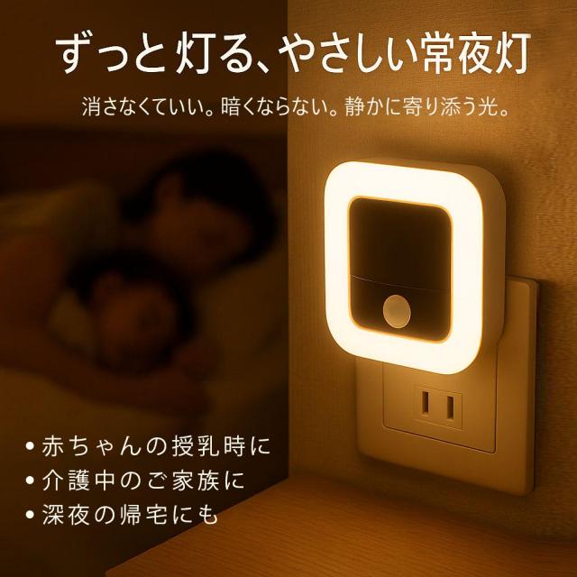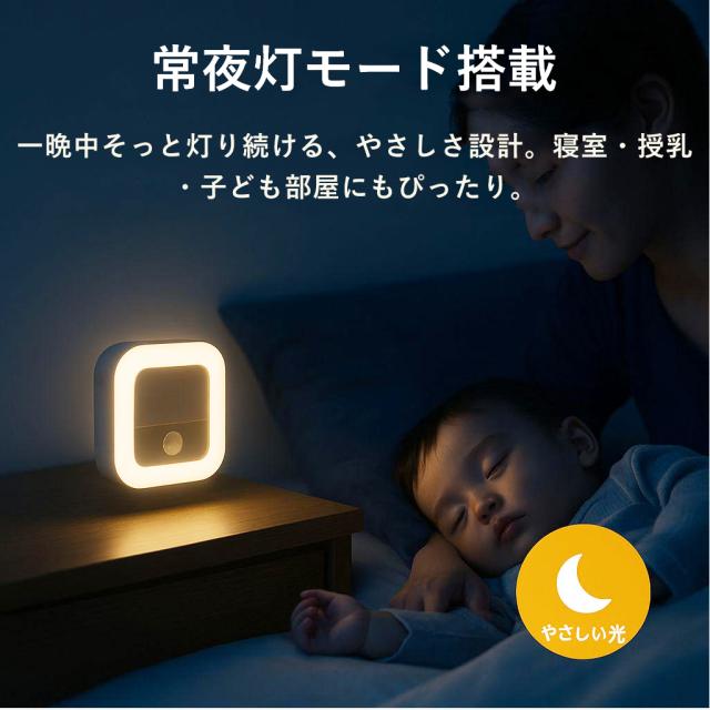 センサーモード中にボタンを押すだけで、常夜灯モードへ切り替え。静かな夜にそっと灯り続ける、あたたかくやさしい光。