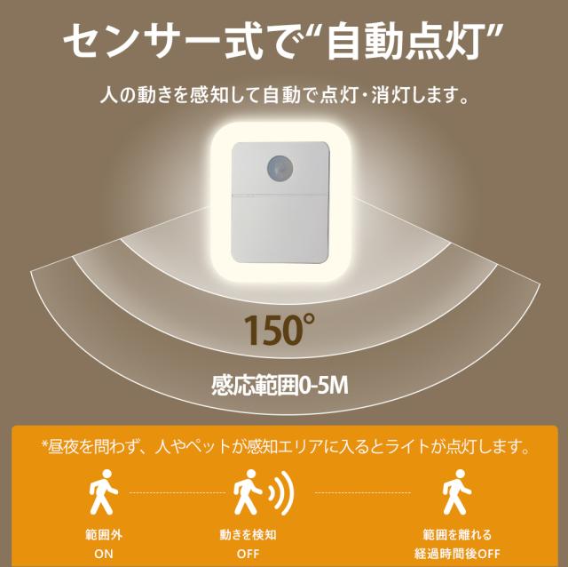*コンセント式は明暗センサーが搭載されていないため、昼夜を問わず、人やペットが感知エリアに入るとライトが点灯します。