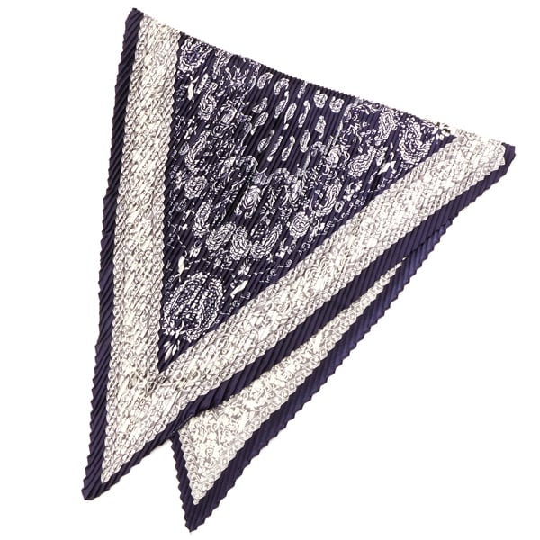 額縁上のペイズリー配色斜めプリーツスカーフになります。首に巻いたりカバンに付けたりワンポイントオシャレにご使用できます。生地はシルクのようなサラサラ生地で肌ざわりの良い生地を使用しているのが特徴です