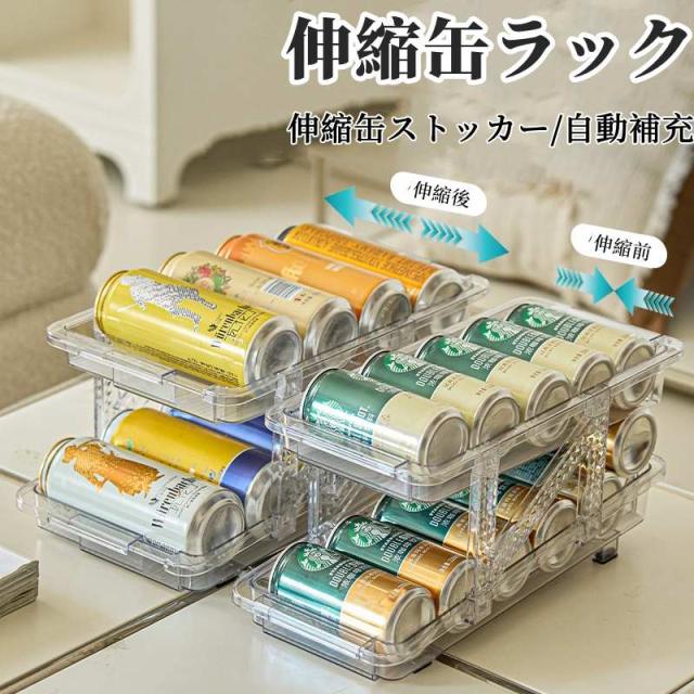 缶ストッカー 伸縮 缶収納ラック 伸縮缶ストッカー 自動補充缶 ビールホルダー 缶収納 冷蔵庫収納 ラック 透明スッキリ 収納棚上も収納に 卓上缶収納 コンパクト 二重仕上げ ラック