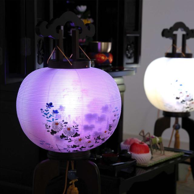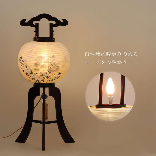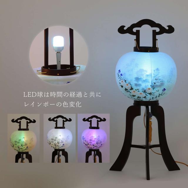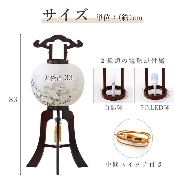 電源は100Vコンセント、電球は2種類が付属します。白熱球は暖かいローソクの明かり、LED球は時間の経過と共に、レインボーの色変化。伝統的な形状の火袋に、さまざまな彩りを映し出します。お好みやシーンに合わせてお選びください。外観サイズは大きすぎず、小さすぎない10号サイズ(火袋直径33cm・高さ83cm)となっています。