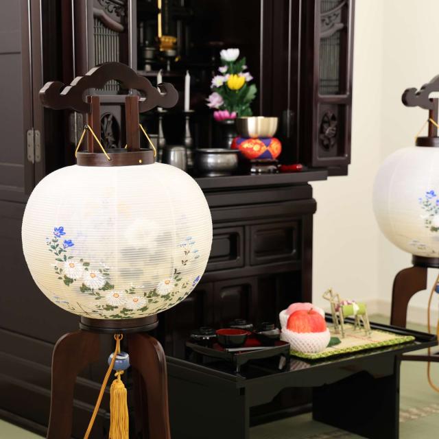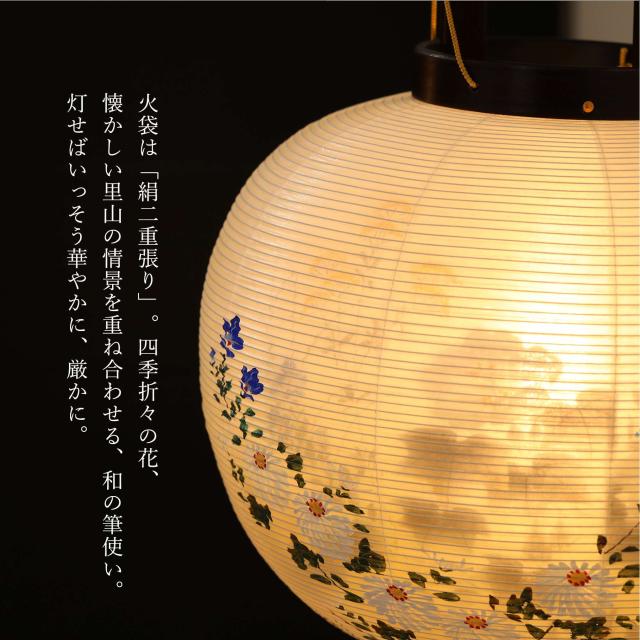 火袋は「絹二重張り」。四季折々の花、懐かしい里山の情景を重ね合わせる、和の筆使い。灯せばいっそう華やかに、厳かに。大切な人と過ごす盛夏のひと時を、心休まる「灯し火」で癒してくれます。