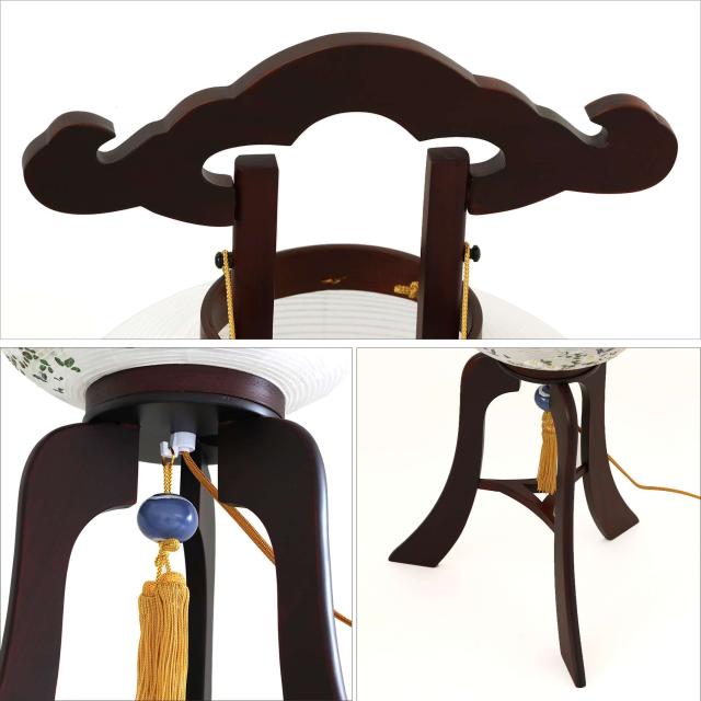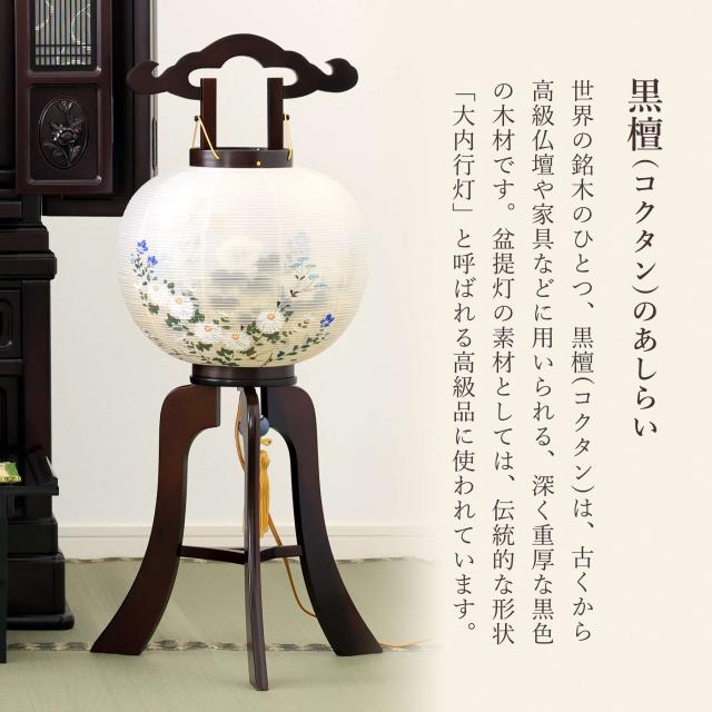 世界の銘木のひとつ、黒檀(コクタン)のあしらい。古くから高級仏壇や家具などに用いられる、深く重厚な黒色の木材です。盆提灯の素材としては、伝統的な形状「大内行灯」と呼ばれる高級品に使われています。