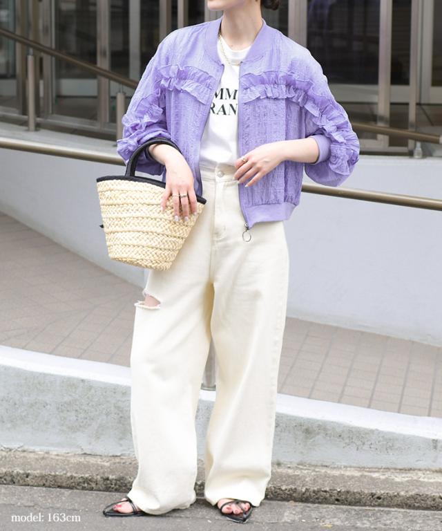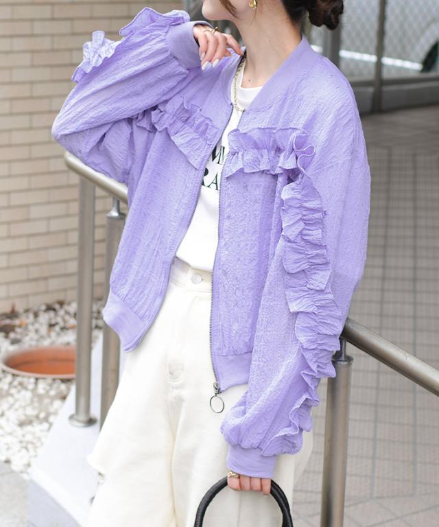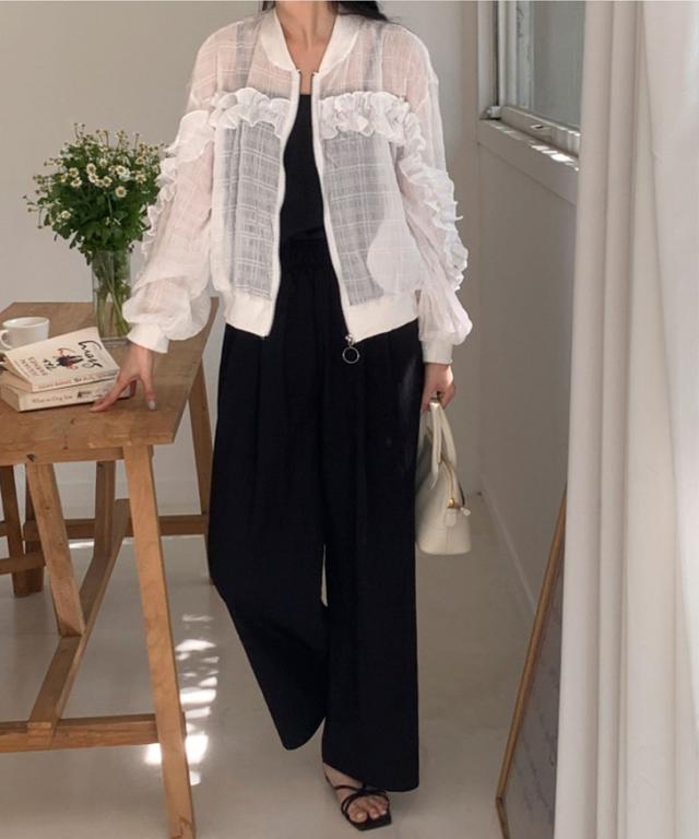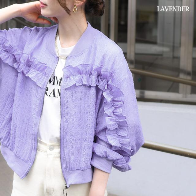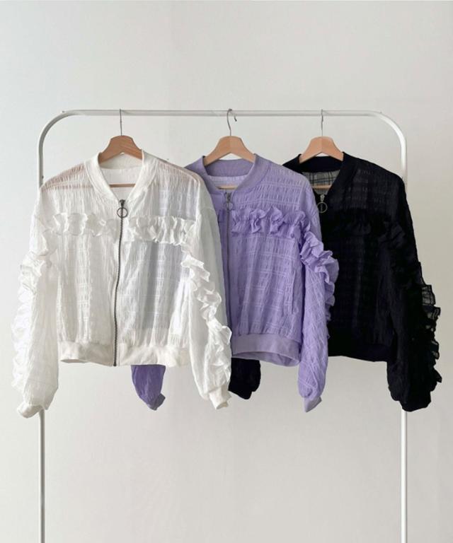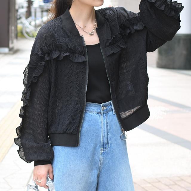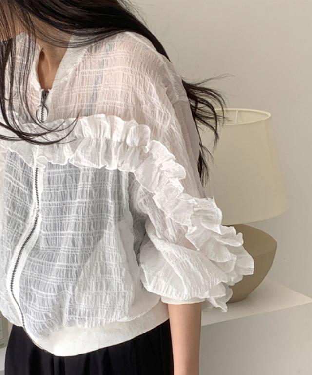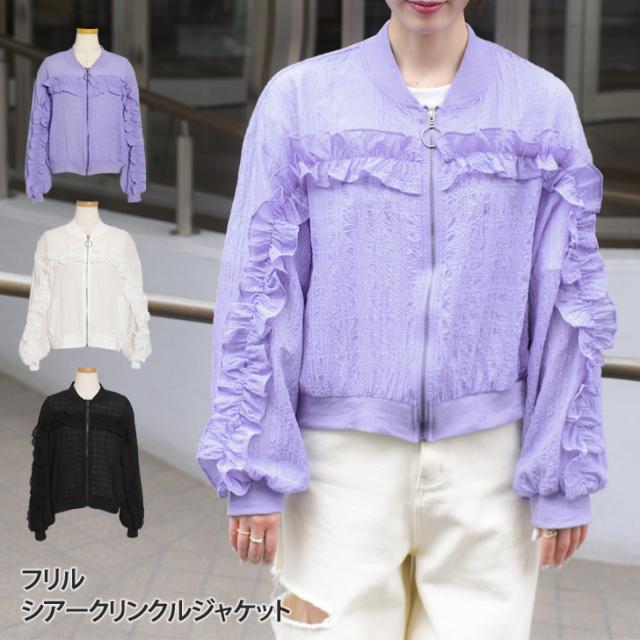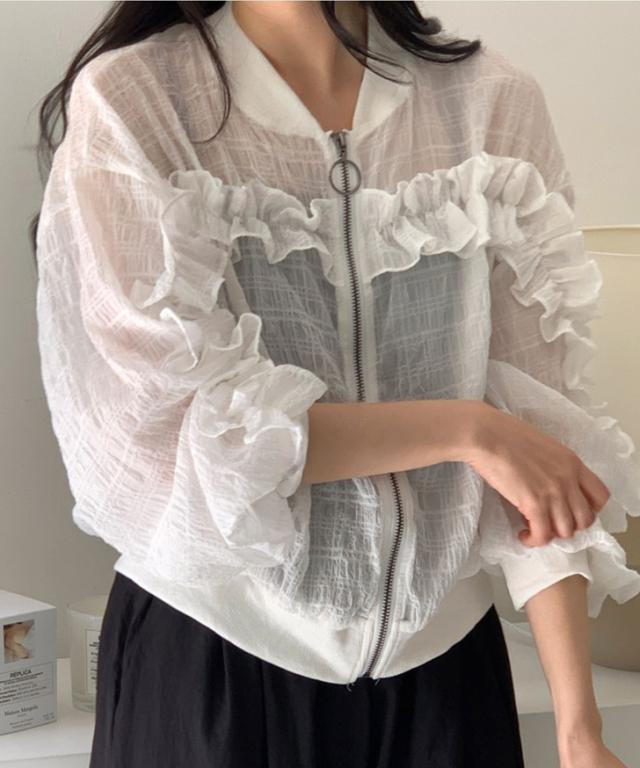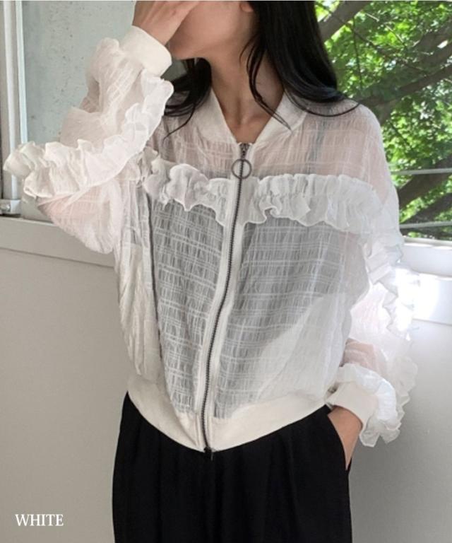 新作 フリルシアークリンクルジャケット レディース 夏 長袖 薄手 カジュアル ジャンパー レイヤード 重ね着 チュール 透け感 ふんわり 軽い 可愛い ガーリー おしゃれ 上着 韓国ファッション 春 涼しい 羽織り