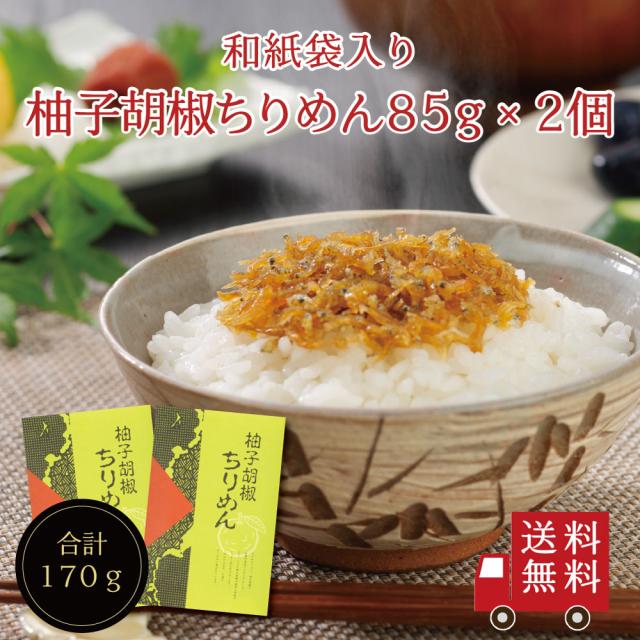 【送料無料】柚子胡椒ちりめん85g 2個セット(和紙袋入り) 不二の昆布 ちりめん佃煮 柚子胡椒 ピリ辛 惣菜 おにぎり ふりかけ お弁当 お試し 家飲み 朝ごはん ご飯のお供 プチギフト プレゼント 帰省土産 お土産 御礼 お礼 挨拶 引越 退職 米 お米 メール便 送料無料