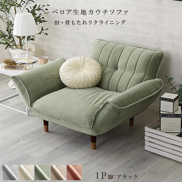 ベロアカウチソファ 1人掛け 単品 (グリーン&ブラック脚) 全5色 リクライニング ロータイプにも ポケットコイル くすみカラー かわいい