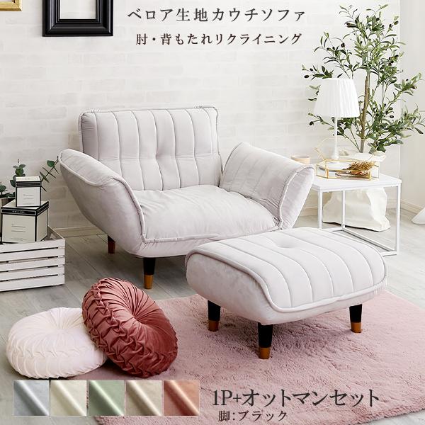 ベロアカウチソファ 1人掛け+オットマンセット (グレー&ブラック脚) 全5色 リクライニング ロータイプにも ポケットコイル くすみカラー かわいい