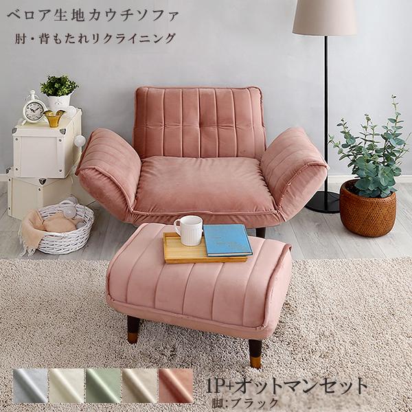ベロアカウチソファ 1人掛け+オットマンセット (ピンク&ブラック脚) 全5色 リクライニング ロータイプにも ポケットコイル くすみカラー かわいい