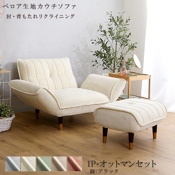 ベロアカウチソファ 1人掛け+オットマンセット (ホワイト&ブラック脚) 全5色 リクライニング ロータイプにも ポケットコイル くすみカラー かわいい