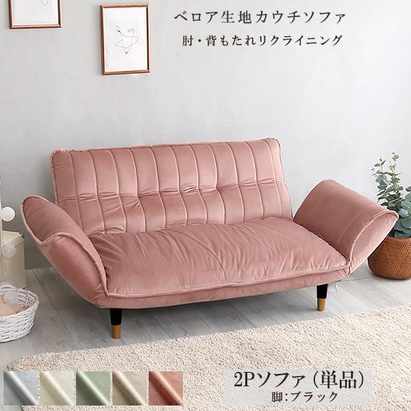ベロアカウチソファ 2人掛け単品 (ピンク&ブラック脚) 全5色 リクライニング ロータイプにも ポケットコイル くすみカラー かわいい