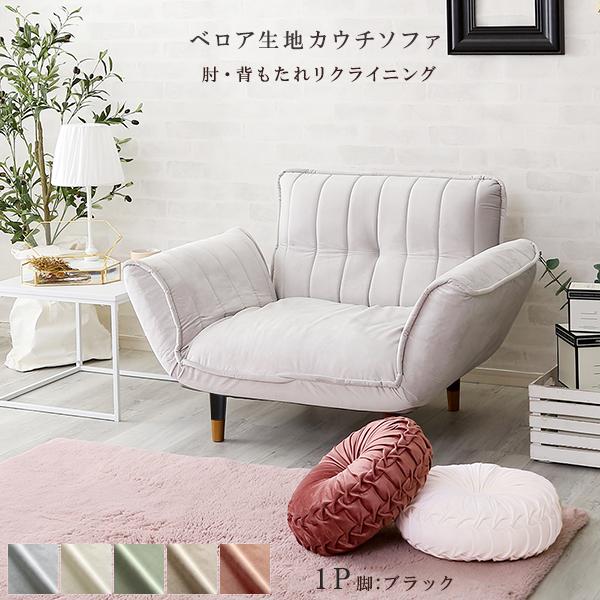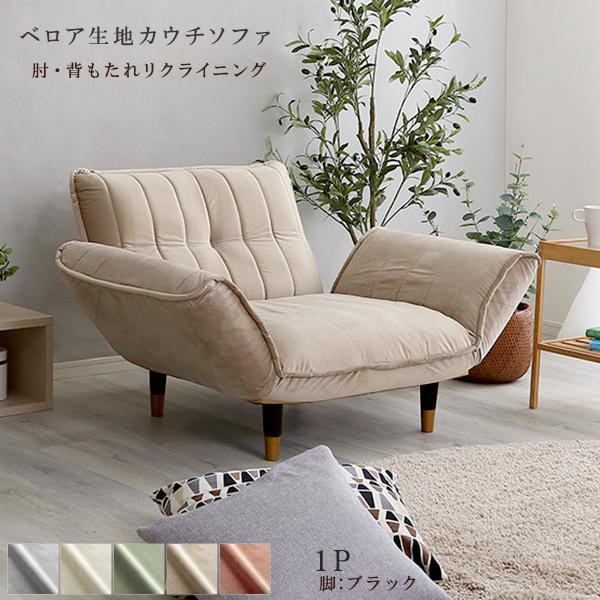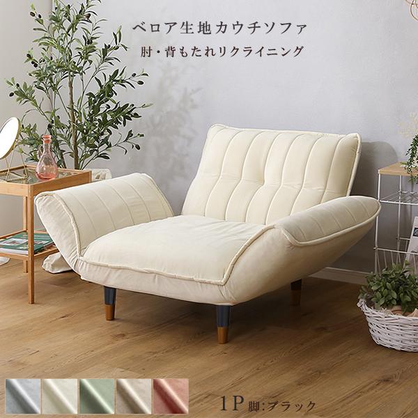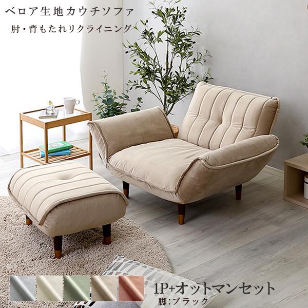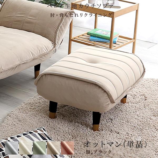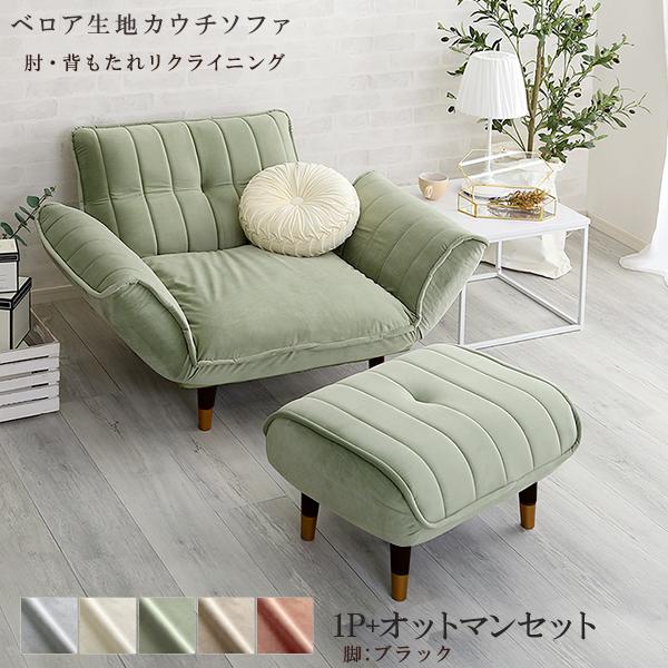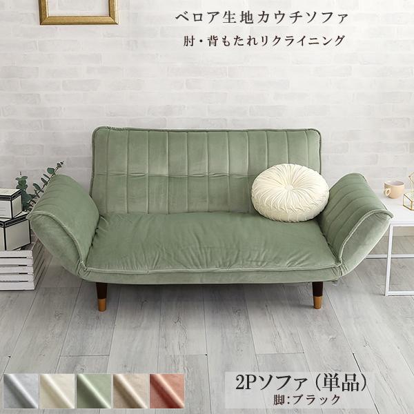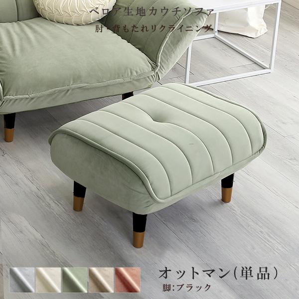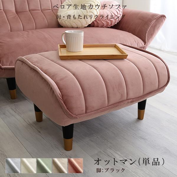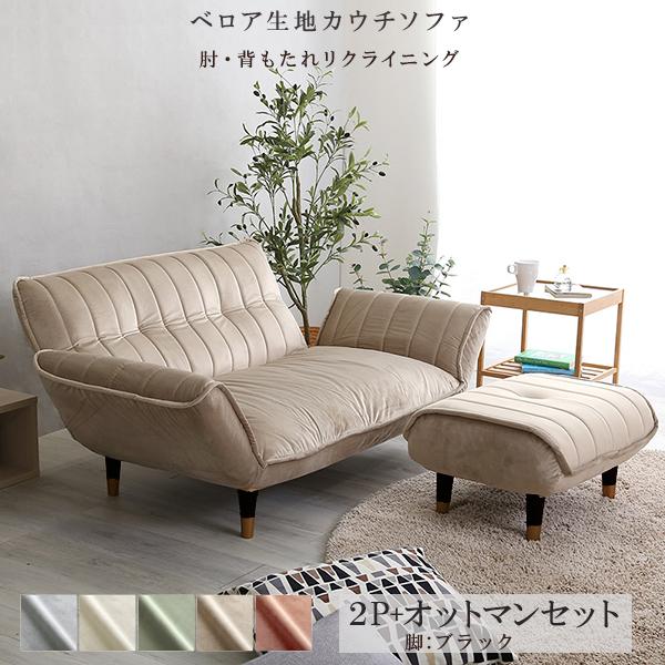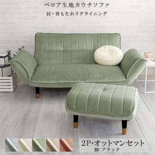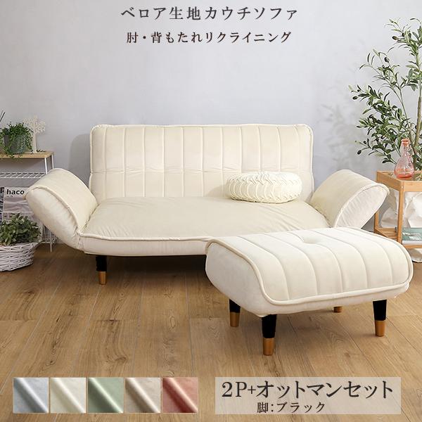 ベロアカウチソファ 2人掛け+オットマンセット (ホワイト&ブラウン脚) 全5色 リクライニング ロータイプにも ポケットコイル くすみカラー かわいい