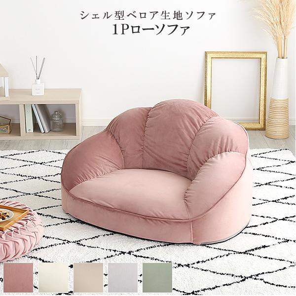 シェル型 ローソファ 1人掛け(ピンク) 全5色 ベロア調生地 くすみカラー シンプル かわいい 軽量 コンパクト ボリュームクッション ソファー