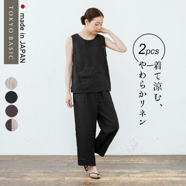 60番手 フレンチリネン100% ノースリーブ ブラウス + ペチパンツ 2点セット 日本製 / パジャマ レディース ノースリーブ ルームウェア 上下セット メール便可 部屋着 夏 麻100 リネン100% 涼しい 速乾 抗菌