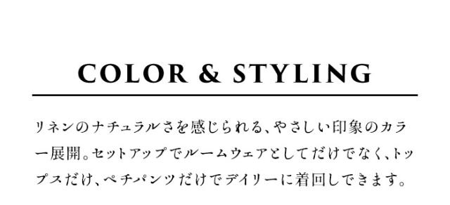 特徴 細番手の糸を使用した、薄手で透け感も楽しめる、柔らかな風合いの、フレンチリネン100%のルームウェア。ゆったりシルエットで風通しがよく、シンプルながらも野暮ったくならない、どこか洗練された、大人に似合うセットアップ。吸放湿性に優れ、速乾性の高いリネンだから、汗をかく季節も快適に過ごせます。元々柔らかな生地感ですが、着て、洗う毎にどんどん柔らかく馴染み、自分だけのリラックスウェアが完成します。