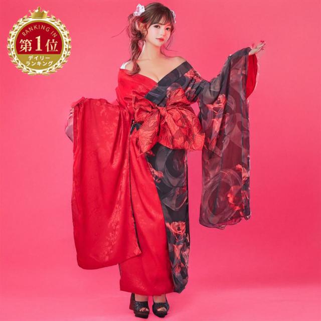 この花魁着物ロングドレスは、その鮮やかなバイカラーとインパクトある花柄が目を引く一品です。
