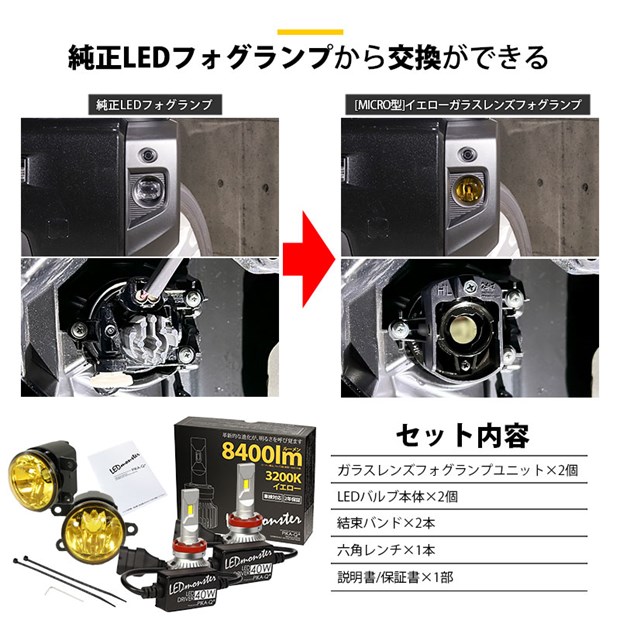 単 H11 led ダイハツ純正 MICRO対応イエローガラスレンズフォグランプキット LED MONSTER L8400 8400lm イエロー 黄色 44-L-5