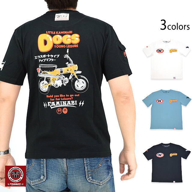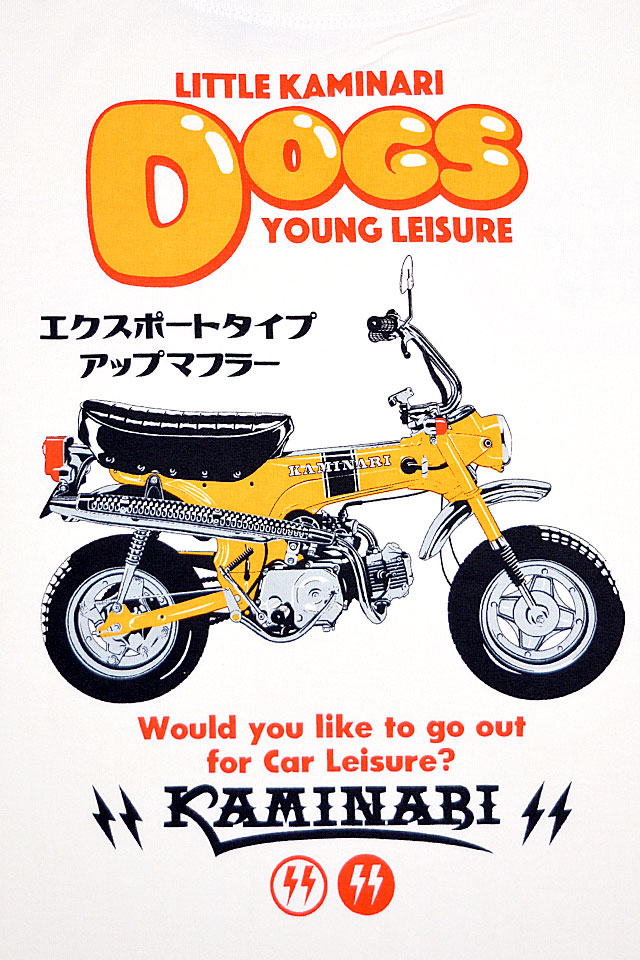 「JAPANESE BAD BOY」をコンセプトに掲げ、昭和の由緒正しき不良文化にロックなスパイスを注入したブランド「カミナリ」より「ドッグス半袖Tシャツ(KMT-235)」が入荷してまいりました。 様々なタイプが存在するミニバイク、ダックスをオマージュしたアイテム。 左袖にはダックスから派生した犬×バイクのアイコンをプリント。 生地はストレッチのきいた、さらりとしたものを使用。 | |||||||||||||||||||||||||