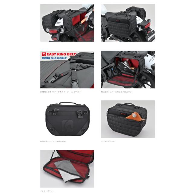 サイドバッグサポート不要の振り分けサイドバッグ。車体にフィットするので、バッグが大きく張り出しません。新開発のサイドバッグ専用イージーリングベルトで、素早く確実に固定できます。バッグ本体はパワーパネルとメタルフレームで型崩れしにくく、車体とあたる部分には傷つけにくい素材を採用。シートバッグ装着時でも荷物を取出しやすい横開きの蓋には、開き切らないストッパーや荷物がこぼれないネットが付いています。外側にはよく使うアイテム収納できるアウターポケット、内側には小物を整理できるインナーポケットもあります。持ち運びに便利なハンドル付きで、パルステープに別売りのシステムポーチを取り付けすることで、自分好みにカスタマイズ可能です。正面のタグは取り外しできます。