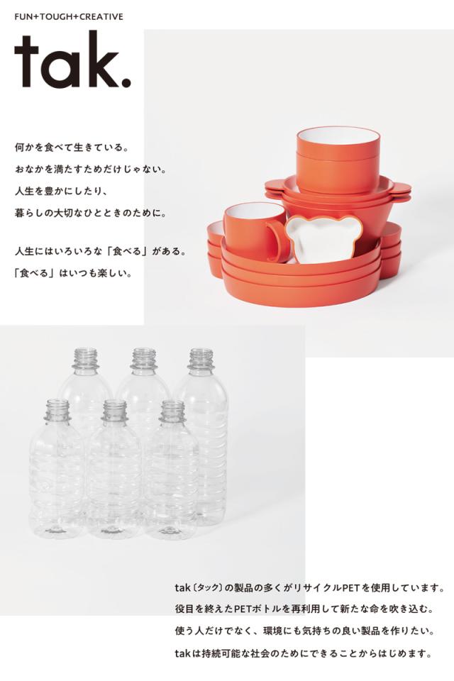 takの製品の多くがリサイクルPETを使用しています。役目を終えたPETボトルを再利用して新たな命を吹き込む。使う人だけでなく、環境にも気持ちの良い製品を作り、持続可能な社会のためにできることからはじめます。