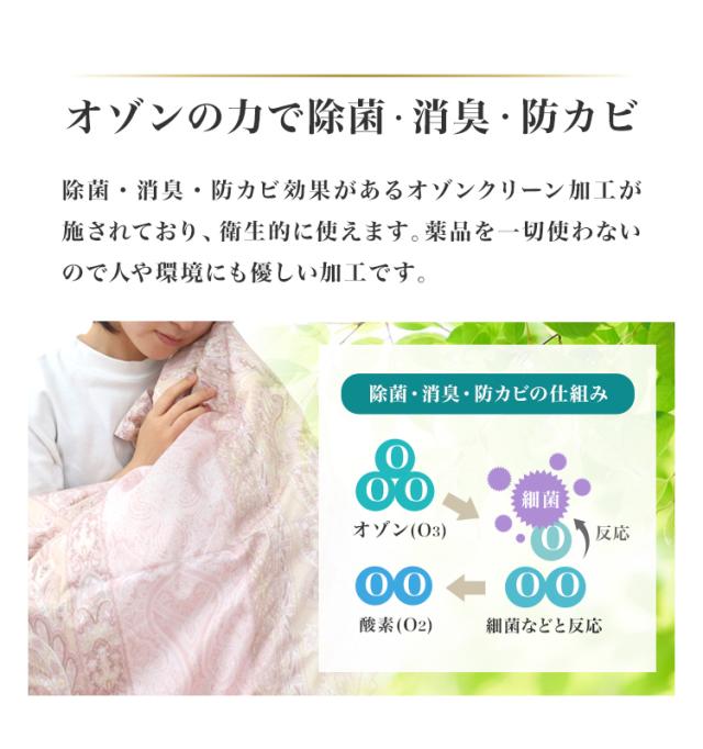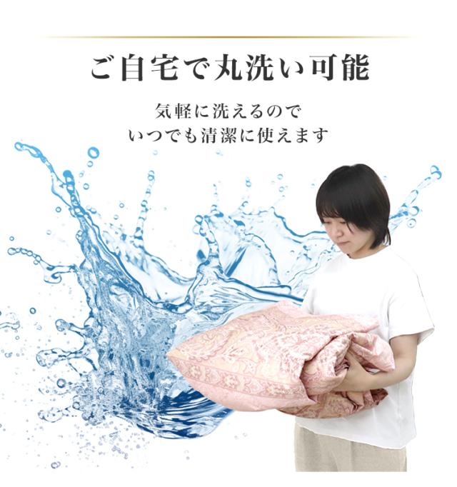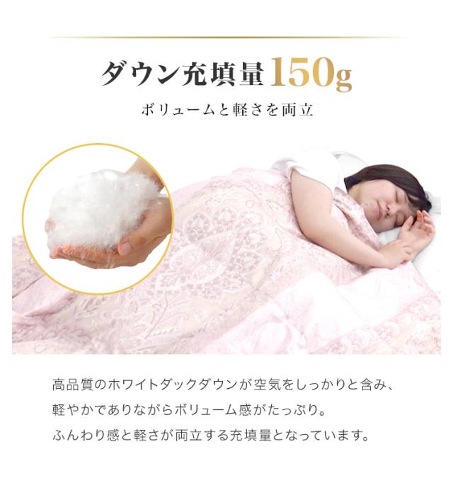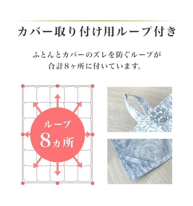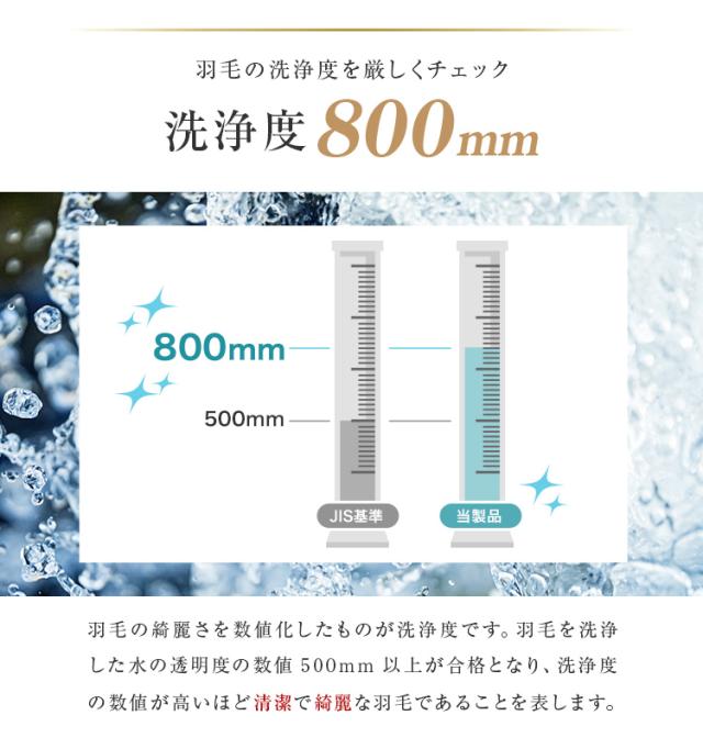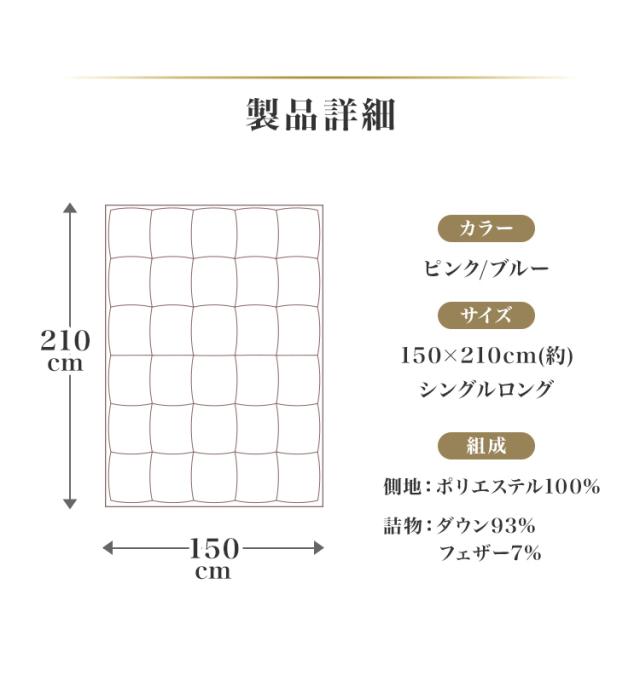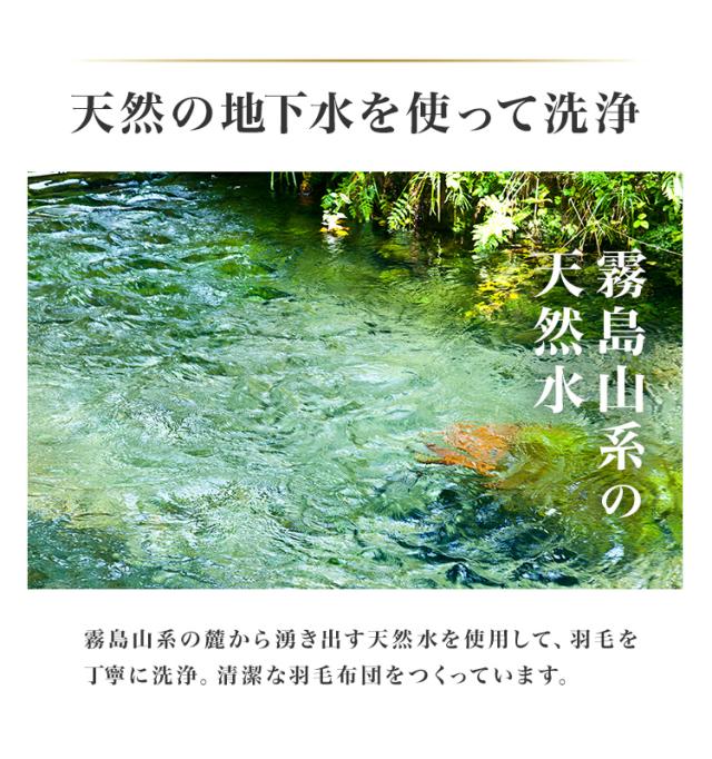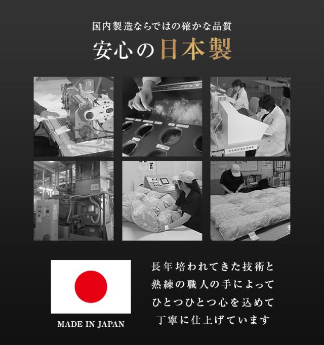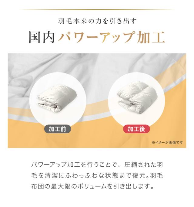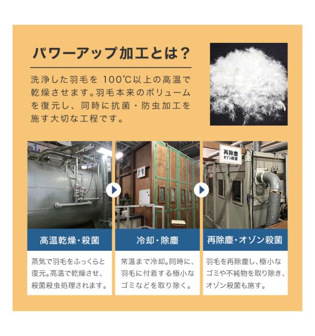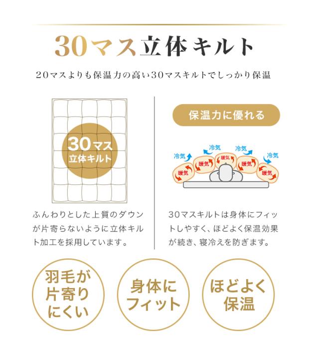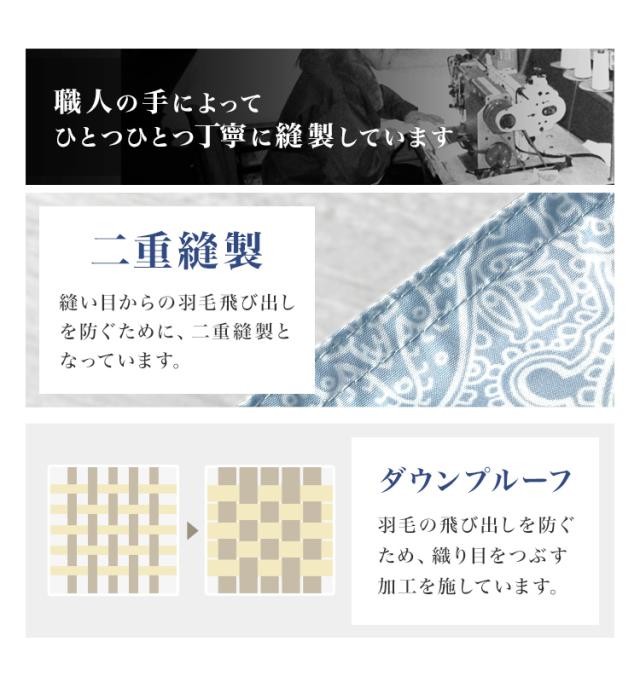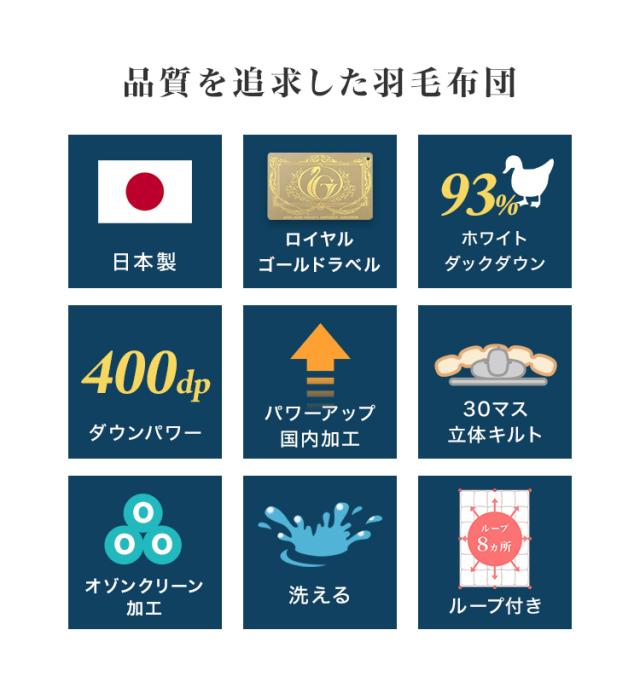 | その他仕様 | 日本製 ダウンパワー400dp以上 除菌防臭加工 30マス立体キルト加工 ダウンプルーフ加工 二重縫製 布団留めループ 8箇所付き オゾンクリーン加工 |