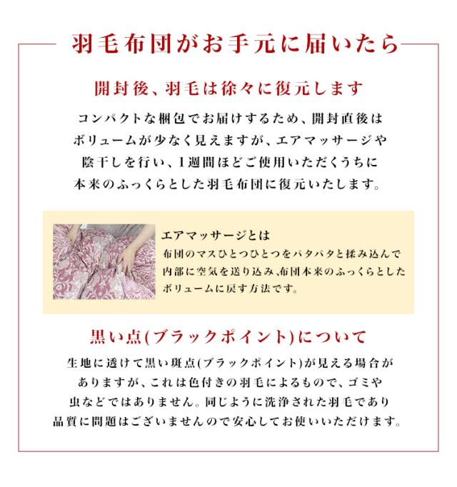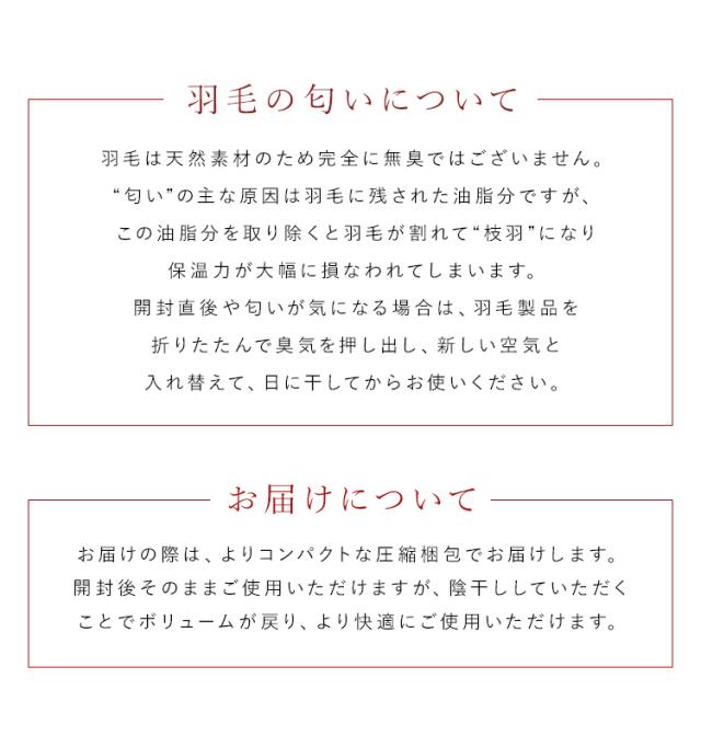 ・羽毛は天然素材のため、無臭ではございません。匂いの主な原因は羽毛に残された油脂分ですが、この油脂分を取り除くと羽毛が割れて枝羽になり保温力が大幅に損なわれます。開封直後に匂いが気になる場合は、羽毛製品を折りたたんで臭気を押し出し、新しい空気と入れ替えて、日に干してからお使いください。 ・一度使用したもの、匂いなどによる交換返品はお受けすることができませんのでご了承ください。 ・開封する際は、カッターナイフなどで商品を傷付けないよう十分ご注意ください。 ・商品は、モニターによって色合いが異なって見える場合があります。 ・仕様・デザインは改良のため予告なく変更することがあります。 |