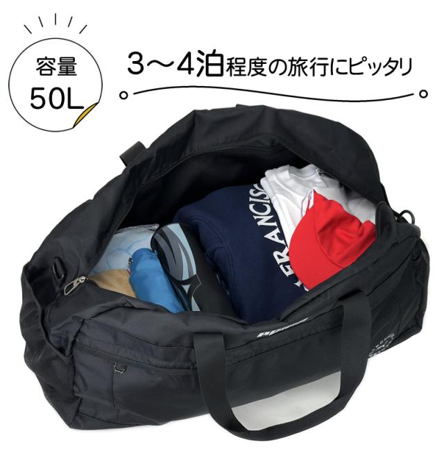 | SPEC | サイズ:約60×32×26cm 容量:約50L 重量:約720g 素材:ポリエステル(撥水加工) ポケット:【外側】ファスナーポケット×1、メッシュポケット×2【内側】ファスナーポケット×1 |
