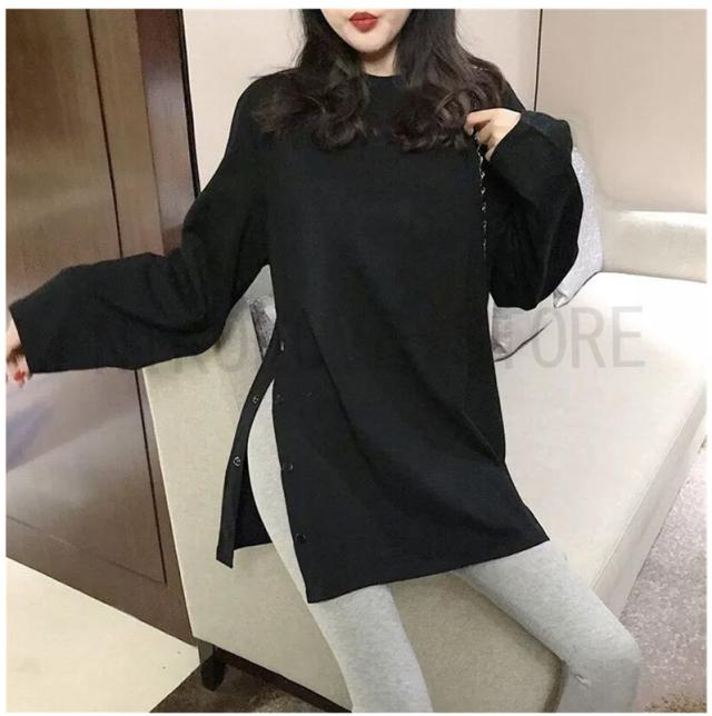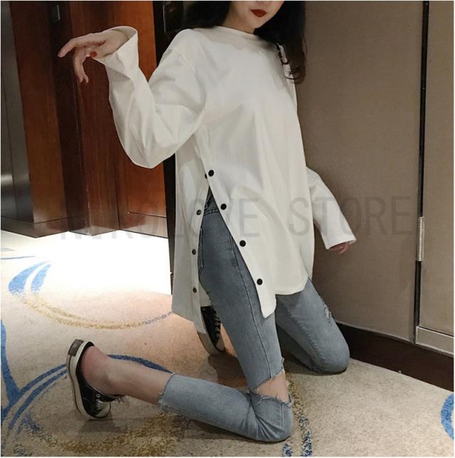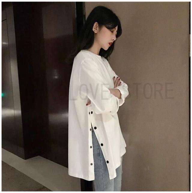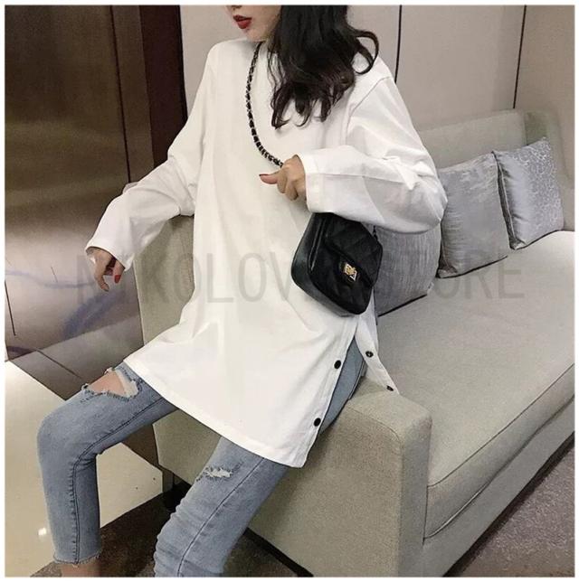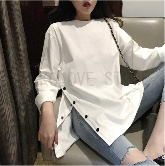 Tシャツ カットソー 裾カット入り 無地 ゆるTシャツ ゆったり 長袖 黒 白 レディース トップス ラウンド襟 お洒落 シンプル 韓国 春秋