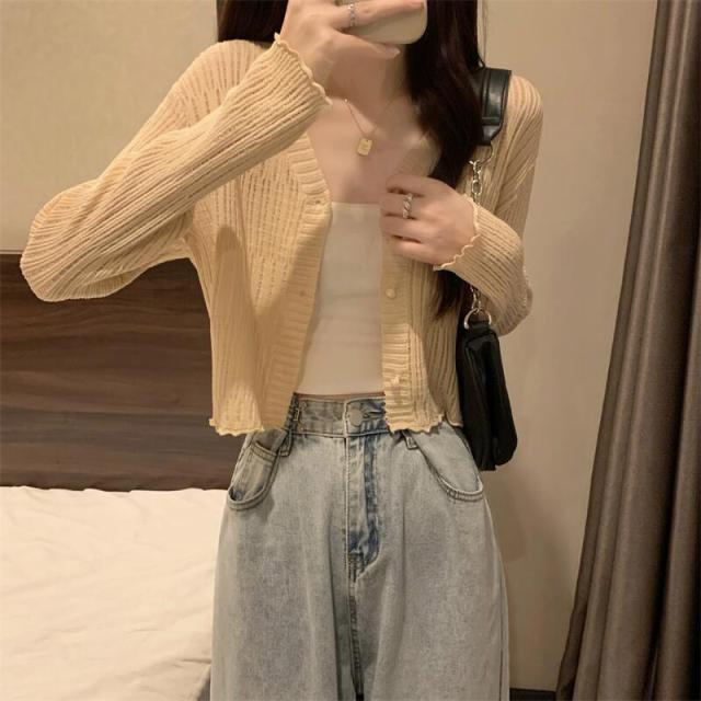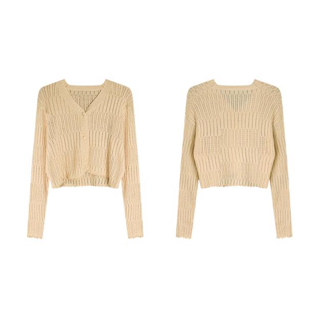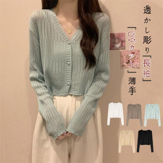 <31日迄2点で100円OFF>カーディガン レディース UVカット透かし彫り 日焼け止め ショート丈 無地 シンプル 春 春服 トップス 長袖 羽織り 薄手 冷房対策