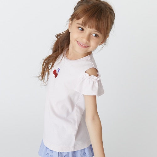 大人っぽい印象のオフショルダーTシャツ。フロントにはさくらんぼのスパンコール入り刺しゅうがアクセントに。1枚だけでなくサロペットなどと一緒にコーディネートするのもおすすめ♪