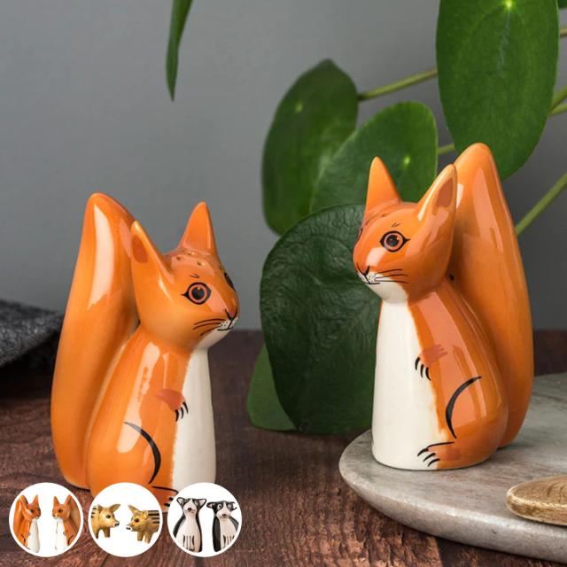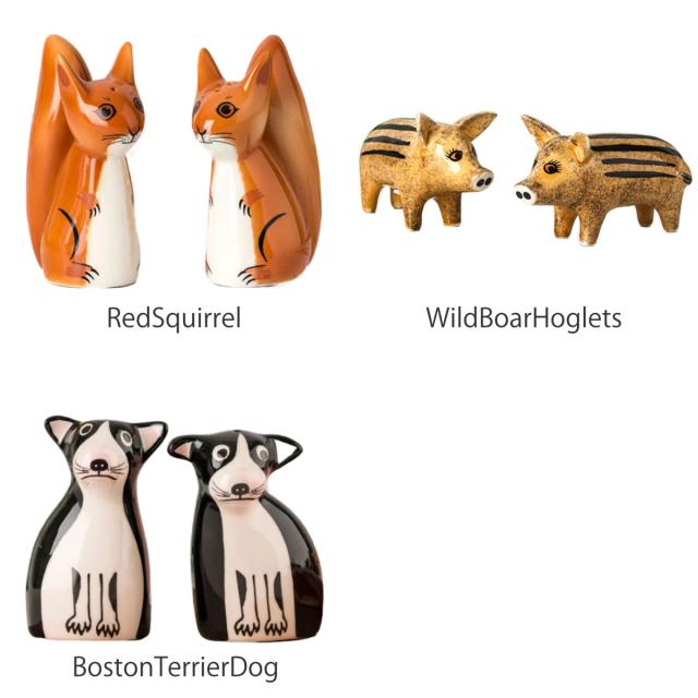 | サイズ | 【RedSquirrel】salt/pepper:約 幅3.8×奥行6.3×高さ8.8(cm) 【WildBoar】salt/pepper:約 幅10×奥行5.5×高さ4.5(cm) 【BostonTerrierDog】salt:約 高さ7(cm)、pepper:約 高さ8(cm) |