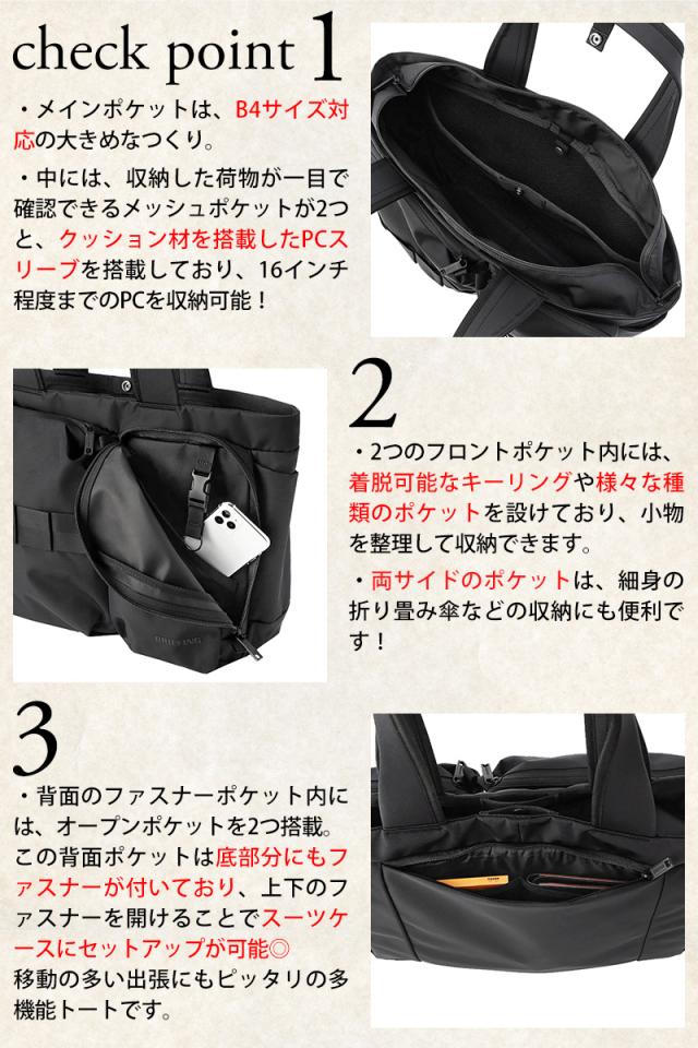 | 備考 | 【メイン開閉】ダブルファスナー 外側/ フロント:ポケット(大)×1(内側にポケット(中)×1、メッシュポケット(中)×1を搭載。) ポケット(中)×1(内側にポケット(小)×1、着脱可能なキーリングを搭載。) サイド:ポケット(小)×2 バック:ファスナーポケット(中)×1(ポケット下部のファスナーを開けるとキャリーサポーターに。内側にポケット(小)×2を搭載。) 内側/ PCスリーブ×1(クッション材搭載、16インチ程度のPCを収納可能。) メッシュポケット(中)×2 キーワード: 高機能性 撥水 耐水 軽い 肩掛け ブラック 黒 仕事 スーツ 旅行 出張 大容量 B4サイズ A4サイズ 10L ノートPC タブレット 収納可能 周辺機器 ビジカジ 仕事 就職祝い 営業 日帰り オフィス IT トラベル 耐久性 20代 30代 40代 50代 社会人 プレゼント ギフト ラッピング ラッピング無料 メンズ レディース 男性 女性 通勤 通学 ビジネス 学生 ブランド ポイント消化 ニューバッグワカマツ | ||