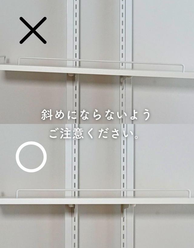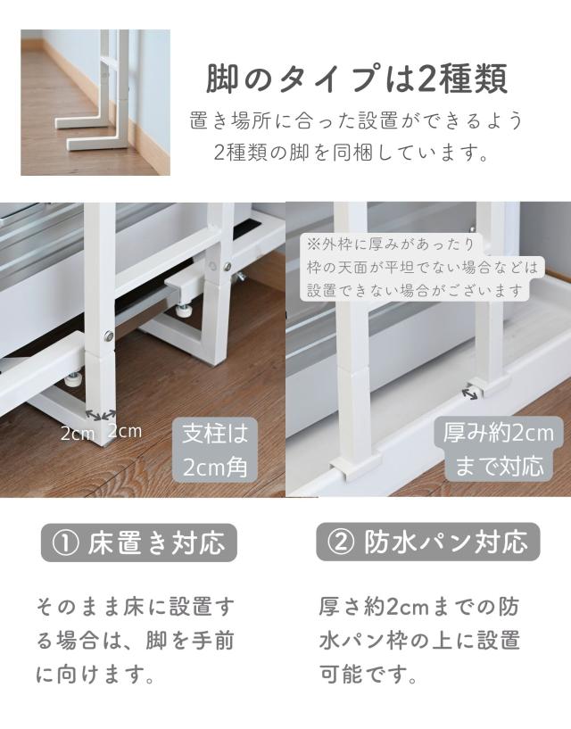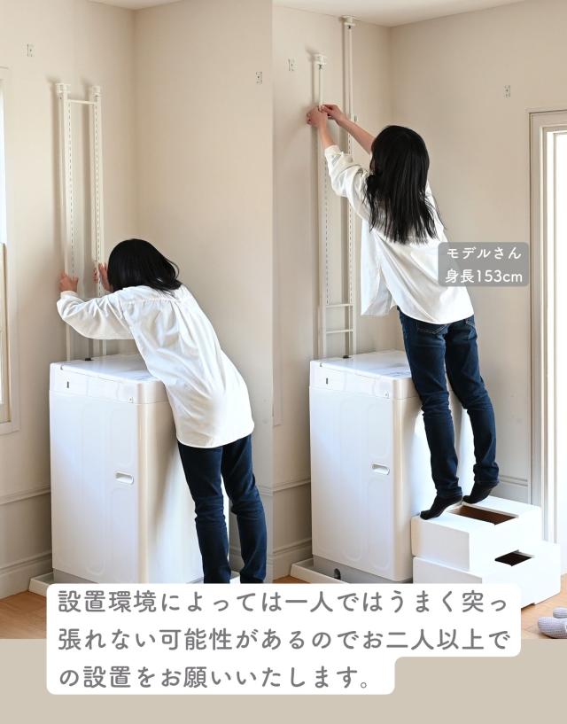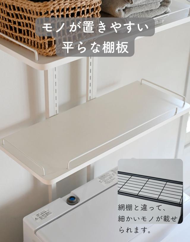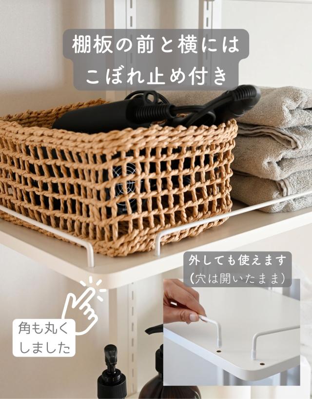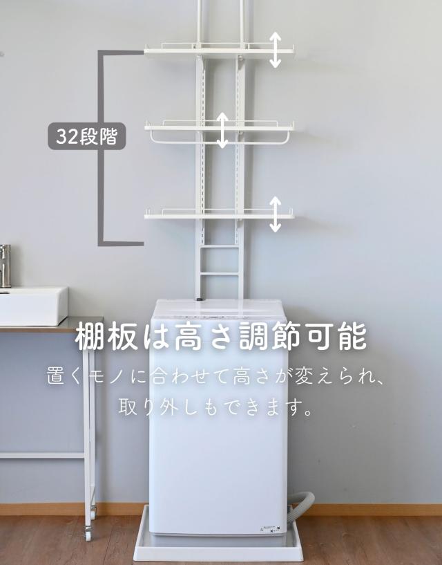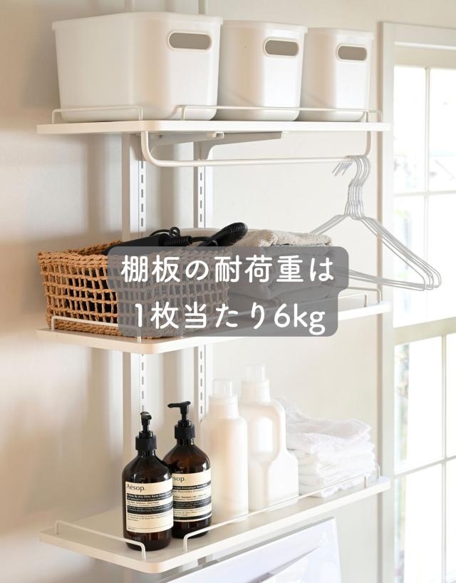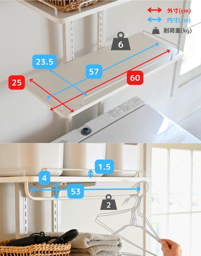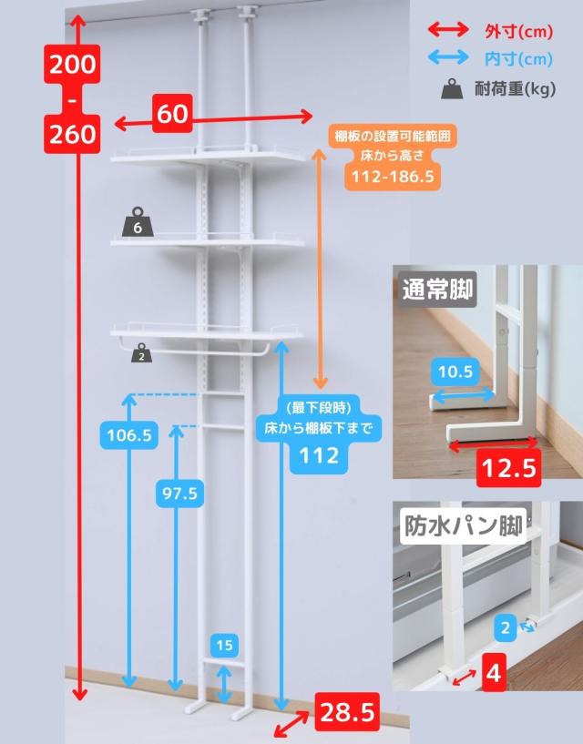 | 商品説明 | ※設置環境によっては踏み台をご用意ください ※2人以上での設置をお願いいたします ●防水パンの上に設置できるランドリーラック ●洗濯機の裏、横を収納スペースとして有効活用 ●天井の高さ200-260cmまで設置可能 ●2.5cm間隔、32段階で高さ調節できる棚板 ●脚部は床置き用、防水パン用が2種類付属 ●棚板サイズ (外寸)幅60 奥行25 厚さ1.5cm (こぼれ止めの内寸)幅23.5 奥行57 ●棚板耐荷重: 各6kg(棚1枚あたり) ●3枚のうち1枚には、取り外し可能なハンガーバーが付属 ●ハンガーバー耐荷重: 2kg ●床から補強バー下までの高さ 15・97.5・106.5cm ●補強バーの太さ 1cm |