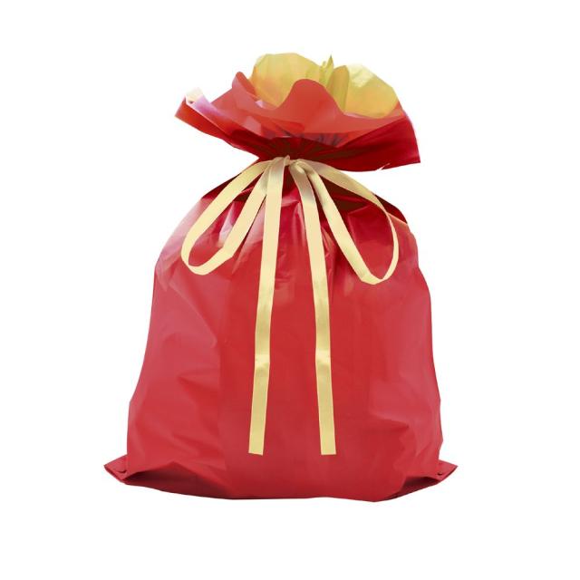中身を入れたら、両サイドのリボンを引っ張るだけで簡単に包める袋です。