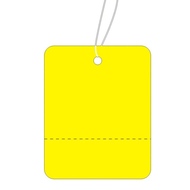 この提札(値札、タグ)は、黄小(H40×W32mm)で糸付き(L約75mm)、ミシン目入、業務用仕立てとなっています。
