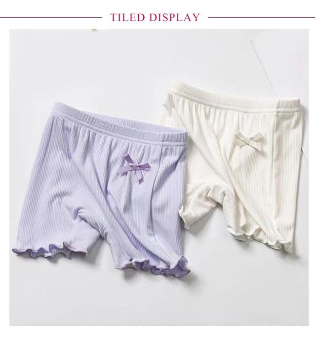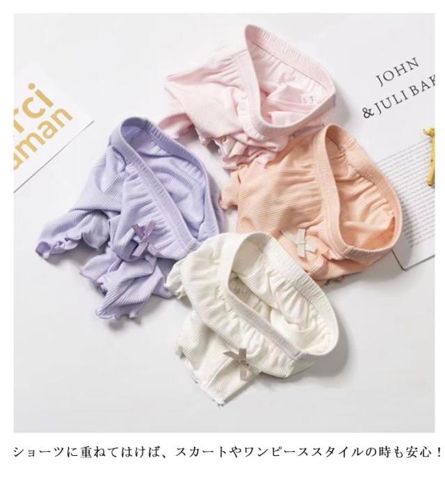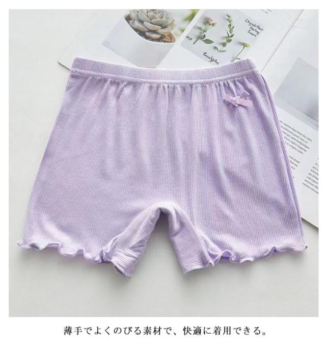 | スカート下にはいて下着のチラ見え防止に!キッズ用オーバーパンツ3枚セット ショーツに重ねてはけば、スカートやワンピーススタイルの時も安心! サイドにあしらった飾りリボンがキュート。 薄手でよくのびる素材で、快適に着用できる。 | |