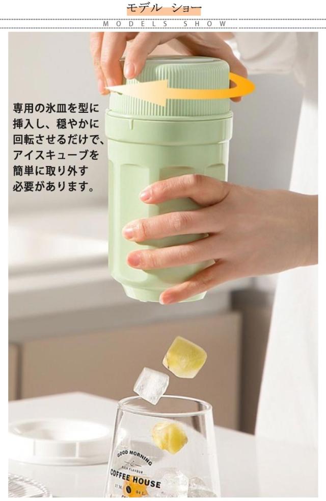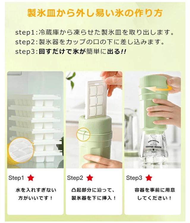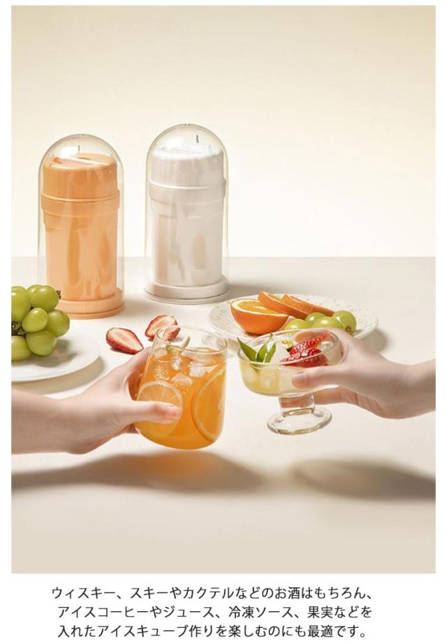 | 回転で氷が取れる!暑い夏に氷を作るときに欠かせないアイテム! 専用の氷皿を型に挿入し、穏やかに回転させるだけで、アイスキューブを簡単に取り外す必要があります。 ほかの氷作る容器が手で氷を一つ一つ外すことより、省力するし、時間も節約する! 全過程が氷に触れることなく、清潔であり、手も濡れてしまう心配がありません。 合計3つの製氷皿は、個別に蓋が付いているため、それぞれ異なる匂いが混ざることを防ぐとともに、スペースを節約できるように重ねられる設計です。 ウィスキー、スキーやカクテルなどのお酒はもちろん、アイスコーヒーやジュース、冷凍ソース、果実などを入れたアイスキューブ作りを楽しむのにも最適です。 | |