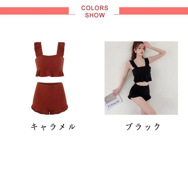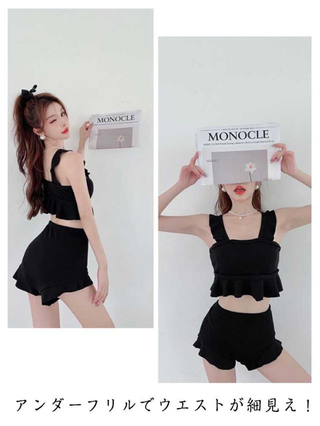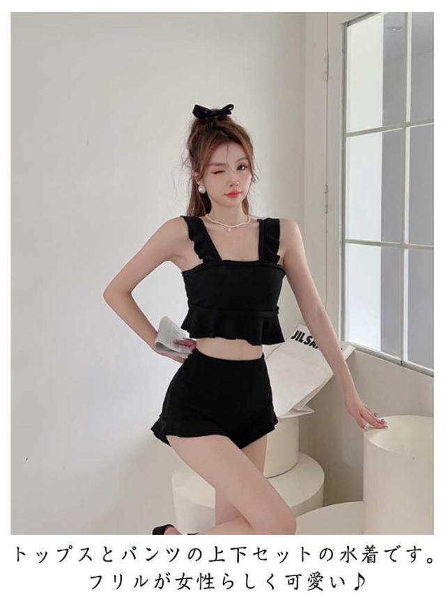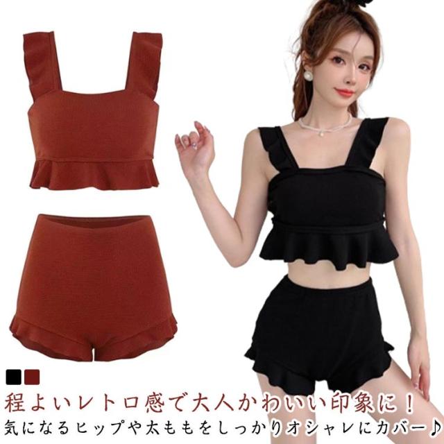 水着 フリルビキニ 水着 2点セット ビキニ 体型カバー タンキニ 20代 お洒落 かわいい ビスチェ風 露出控えめ レディース セパレート 30代 大人 女性用 黒 フリル ハイウエスト ワイヤーなし 小胸水着 上下セット