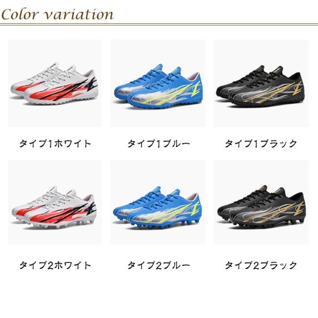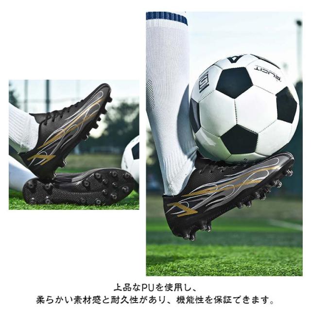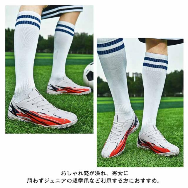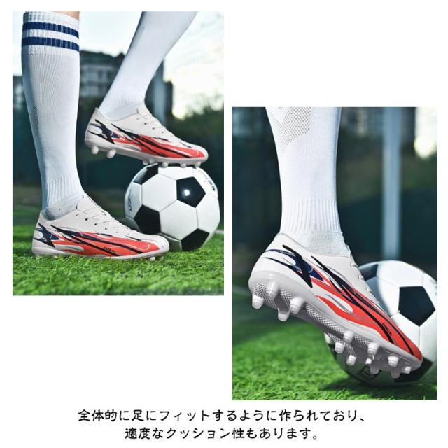 | 21-28.5cm!サッカーのトレーニングや試合などで履くサッカーシューズ。 靴底にはスタッドが付いて、グリップ力が強くて、滑りにくく丈夫なので、スポーツシューズとしては最適。 全体的に足にフィットするように作られており、適度なクッション性もあります。 上品なPUを使用し、柔らかい素材感と耐久性があり、機能性を保証できます。 おしゃれ感が溢れ、男女に問わずジュニアの通学用など利用する方におすすめ。 土グラウンド、天然芝、人工芝に対応しています。 | |