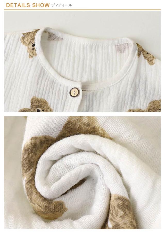 | ふんわりとしたダブルガーゼ素材が肌に心地良い、お子様向けルームウェア。 リラックスしてお家時間を過ごせるよう、締付けの少ないシルエットに。 パンツは総ゴム仕様でお着替えも楽ちんです。 薄手なのでサラッとした着心地、吸汗性に優れて、汗をたくさんかく夏でもサラサラ。 通気性、吸水性、速乾性に優れており、適度な保温性があり寝る時も着心地が良く快適です。 80cm〜130cmと豊富なサイズ展開、お友達や姉妹でおそろいも!おうち時間も可愛く過ごせるアイテムです。 薄手の長袖なので、春・秋はもちろん、夏のエアコンが効いた部屋でも活躍します。 | |