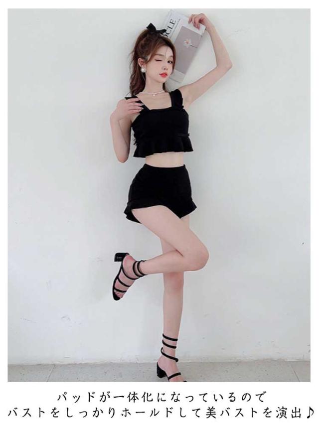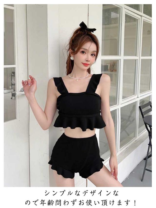 レディース タンキニ 女性用 2点セット フリルビキニ 水着 20代 セパレート お洒落 ビキニ 体型カバー 露出控えめ 10代 水着 30代 大人 ビスチェ風 黒 フリル ハイウエスト ワイヤーなし 小胸水着 上下セット