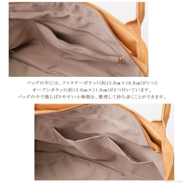 バッグの中には、ファスナーポケット(約13.0×18.0cm)が1つと、オープンポケット(約13.0×11.0cm)が2つが付いています。